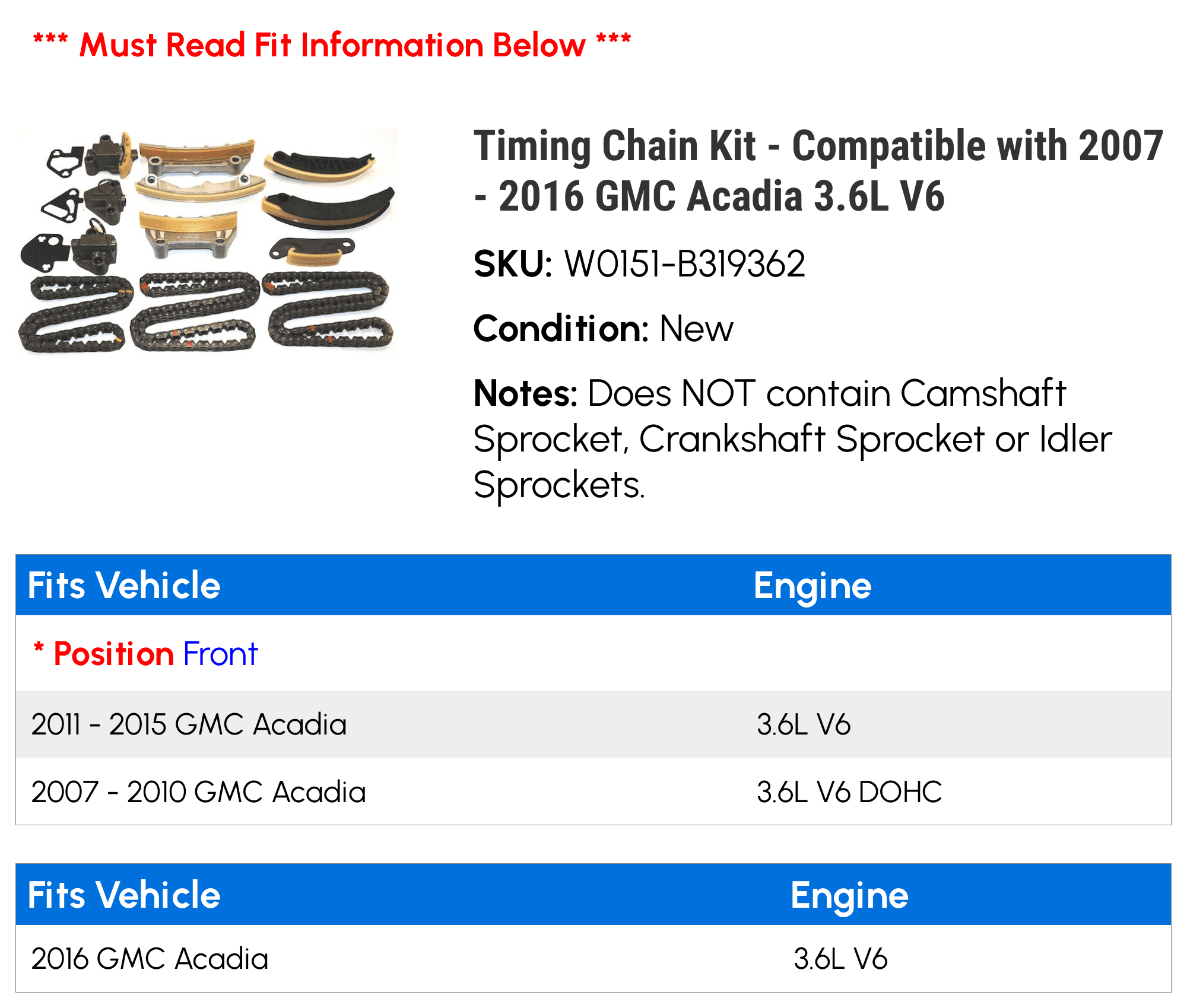 Timing Chain Kit Compatible With 2007 2016 Gmc Acadia 3 6l V6 2008 2009 2010 2011 2012 2013 2014 2015 Walmart Com